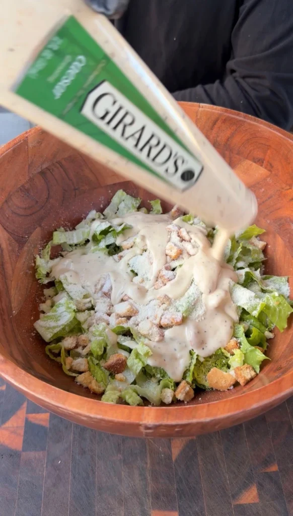 In a large bowl, combine 2 cups of chunky-chopped romaine lettuce, 1/2 cup croutons, 1/2 cup grated Parmesan cheese, and 1/2 cup Caesar dressing. Toss gently until the romaine is lightly coated. Don’t overdress. The bread already has dressing on it, and you’ll drizzle more over the chicken. The salad layer should add crunch and freshness, not extra moisture. Toss right before building so the croutons stay crunchy.