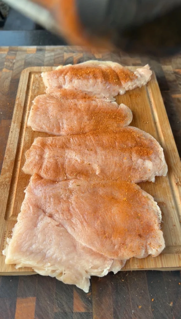 1. Butterfly chicken breasts and pound to even thickness. Season both sides with poultry seasoning, salt, and pepper.