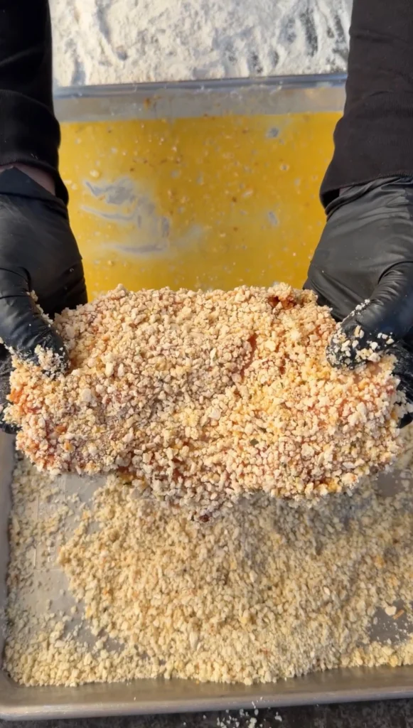 Butterfly and pound chicken thin. Season both sides. Dredge: flour → egg → panko. Press crumbs firmly.