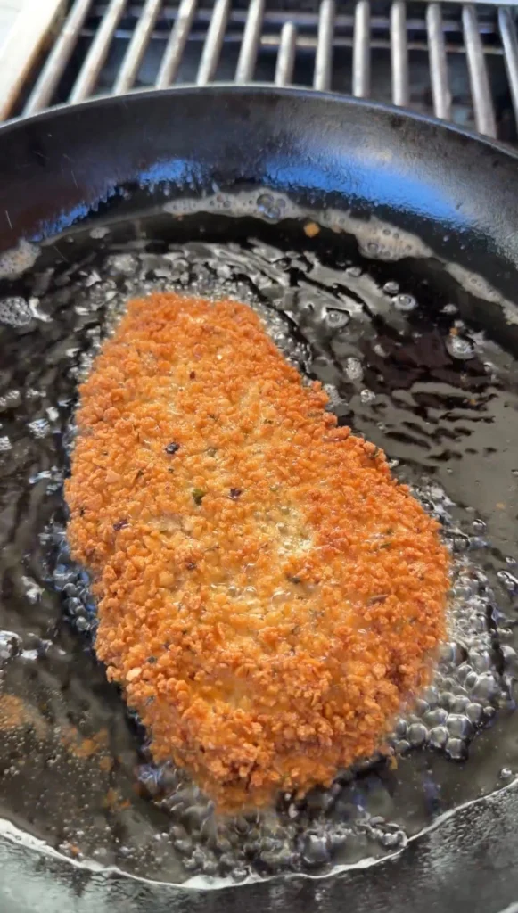Place the breaded cutlets gently into the oil. Don’t move them for the first 3 minutes. The panko needs uninterrupted contact with the hot oil to set and crisp. Flip once when the bottom is deep golden brown. Cook the second side for another 3 to 4 minutes. The chicken is done when the internal temperature reads 165°F and the coating is uniformly golden on both sides. Transfer to a wire rack to rest. Avoid paper towels because they trap steam underneath and soften the breading.
