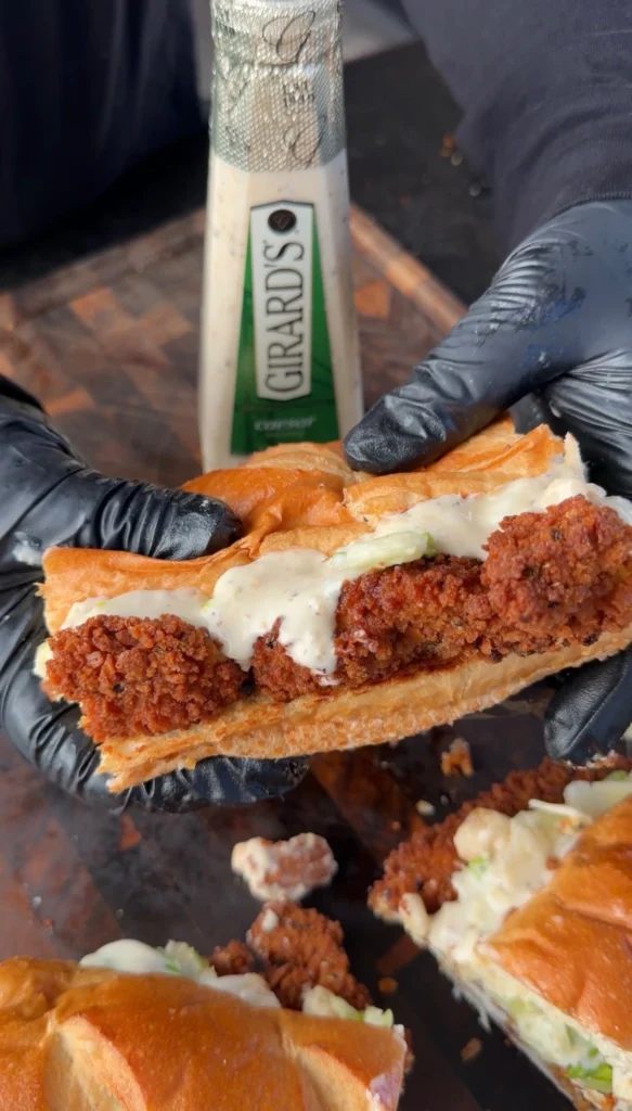 Slice and toast the baguette. Spread Caesar dressing on both sides. Layer crispy chicken, drizzle more dressing, top with chunky Caesar salad.