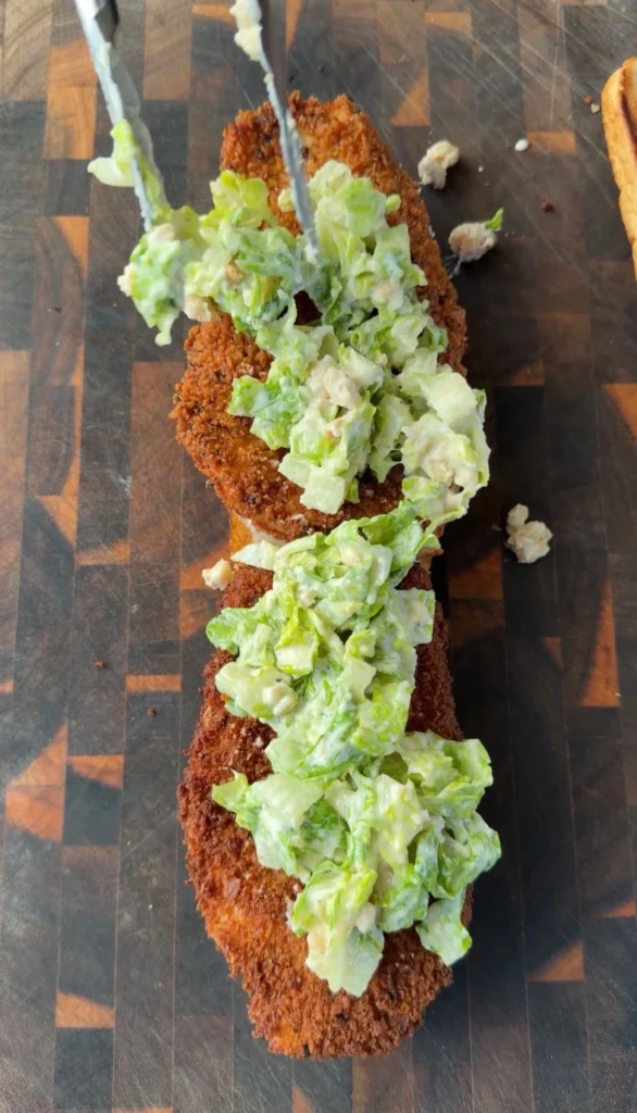 Bread and fry the chicken ahead, then reheat in a 375°F oven or air fryer to restore crispiness. Keep the Caesar salad and bread separate until you’re ready to assemble. Building the sandwich too far in advance makes everything soggy. Assemble right before eating.