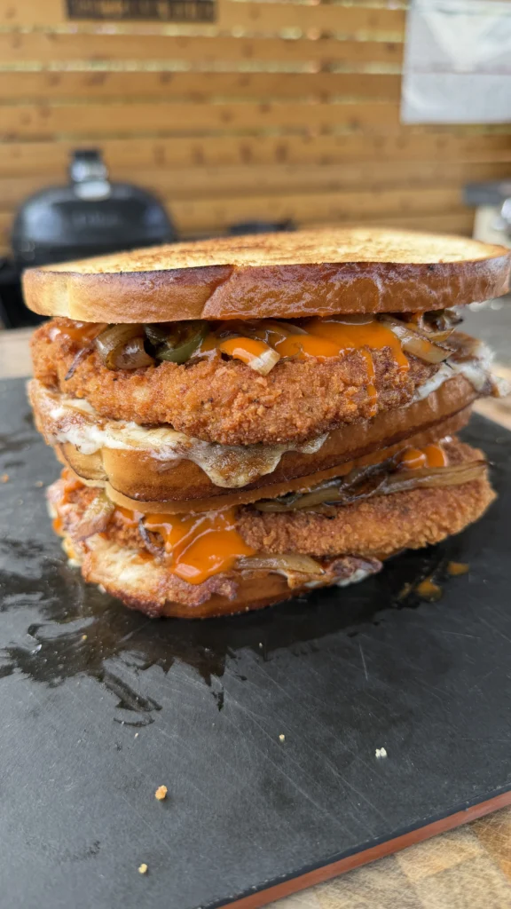 The whole process takes about 35-40 minutes from start to finish. You pound the chops thin, bread them in a three-step flour-egg-panko setup, shallow fry them for 3-4 minutes per side until they hit 145°F internal, then sauté jalapeños and onions in the drippings, make crispy cheese bread on the griddle, and stack everything together. These panko pork chop sandwiches are messy, over-the-top, and absolutely worth every bite.