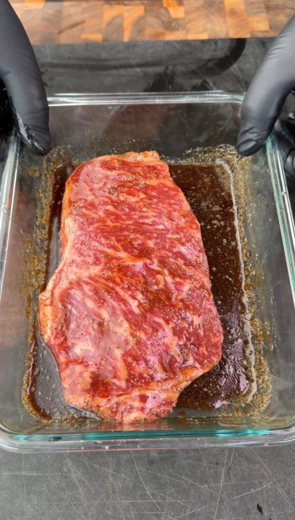 The strip’s flavor profile is beefy without being as rich as ribeye, allowing the marinade and dipping sauce to shine through rather than competing with the meat. Ribeye’s higher fat content can make it feel heavy when combined with the bold, salty dipping sauce, while strip provides better balance. The strip also has a single muscle without the fat pockets that ribeye contains, making it easier to slice into uniform pieces for presentation.