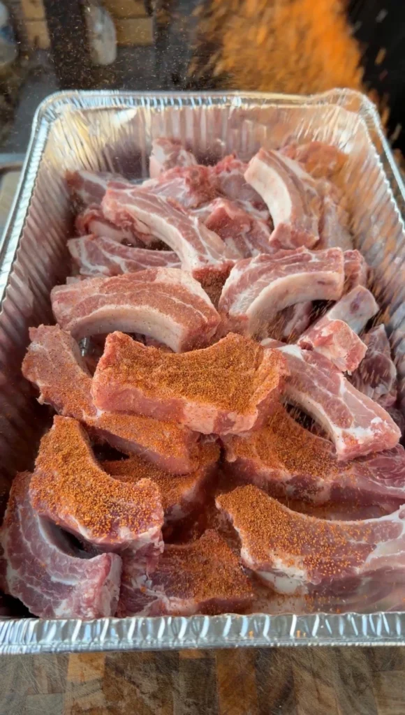 Arrange all the individual ribs on a large tray or cutting board. Season them generously on all sides with your favorite sweet BBQ seasoning. Since ribs are cut into individual pieces, you can season all surfaces easily – just pick up each rib and sprinkle seasoning on all four sides. Use approximately 1/4 cup total seasoning for 2 racks. Let the seasoned ribs rest at room temperature for 15-20 minutes while you preheat the smoker.