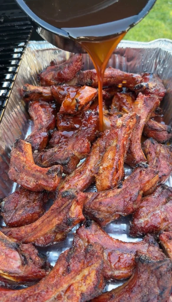 After 2 hours of braising, carefully remove the pan from the smoker using heavy oven mitts – it will be very hot and full of liquid. Remove the foil cover carefully as hot steam will escape. The ribs should be extremely tender, nearly falling apart. The sauce will have reduced somewhat but should still be liquid, not dry.