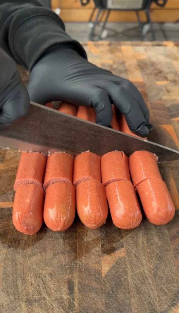 Remove 1 pack of thick-cut bacon from packaging. Count the hot dog pieces (should be around 32) and determine how many bacon slices you need. Each hot dog piece needs half a bacon slice. For 32 pieces, you’ll need 16 full bacon slices. Cut each bacon slice in half crosswise (the short way). You now have bacon half-slices ready for wrapping.