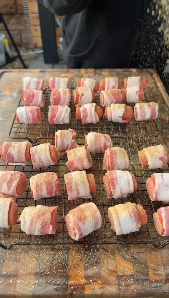 Season the bacon lightly, not the hot dogs. The bacon needs flavor since it’s bland on its own, but the hot dogs are already heavily seasoned and salted. Over-seasoning creates overly salty bites. The light dusting on the bacon before wrapping provides perfect seasoning balance while the BBQ glaze adds sweetness during the final 30 minutes.