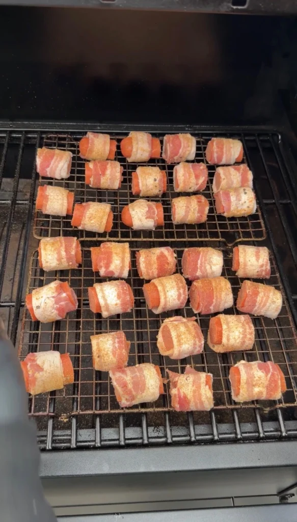 You’re looking for bacon that’s fully rendered with crispy edges. The bacon should be golden-brown and firm to the touch, not soft or flabby. Any visible fat should be rendered to crispy bits. The hot dogs will have slight char marks from the grate and have absorbed smoke color. Total smoking time is typically 60-90 minutes depending on bacon thickness and how crispy you like it.