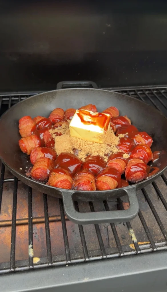 The whole process takes about 2-2.5 hours from start to finish. Spend 20 minutes slicing hot dogs, cutting bacon, and wrapping each piece. Smoke for 60-90 minutes until bacon crisps completely. Toss in glaze and smoke for 30 more minutes. Rest for 5-10 minutes before serving. The 250°F smoking temperature renders bacon fat slowly without burning while allowing smoke penetration. The two-stage cooking ensures crispy bacon before adding the sweet glaze that would prevent proper crisping if applied too early. One pack of hot dogs makes approximately 32 bites, perfect for parties or as an appetizer before the main BBQ.