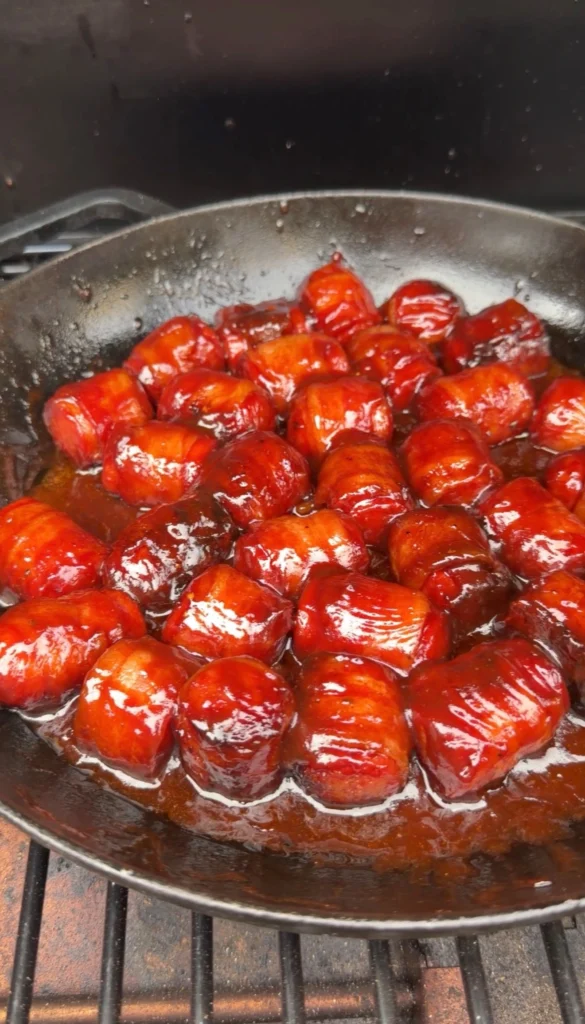 Hot dog burnt ends borrow this technique and apply it to bacon-wrapped hot dog bites. Like traditional burnt ends, these are small pieces that get smoked until crispy, then tossed in sweet sauce and returned to heat until the glaze caramelizes. The final product has that characteristic sticky, caramelized exterior that defines burnt ends. The bacon provides the “burnt” crusty exterior while the glaze creates sticky sweetness.