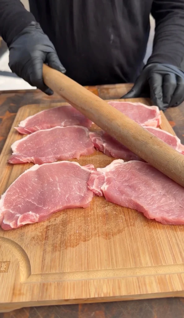 Place each pork chop between two sheets of plastic wrap. Use the flat side of a meat mallet, not the spiked side, for thin sandwich chops. Start from the center and work outward in even strokes. The goal is uniform thickness across the entire chop. If one end is thicker than the other, that thick section will be undercooked when the thin section is done. Even thickness means even cooking, which means every bite has the same crispy-to-tender ratio.