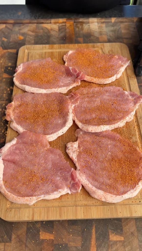 Place each boneless pork chop between two sheets of plastic wrap. Use the flat side of a meat mallet to pound to about 1/4 inch thickness. Start from the center and work outward for even results. Uniform thickness is critical because thin spots cook faster than thick spots. If the chop is uneven, one end will be dry while the other is undercooked. Season both sides generously with your favorite all-purpose seasoning blend (salt, pepper, garlic powder, paprika).