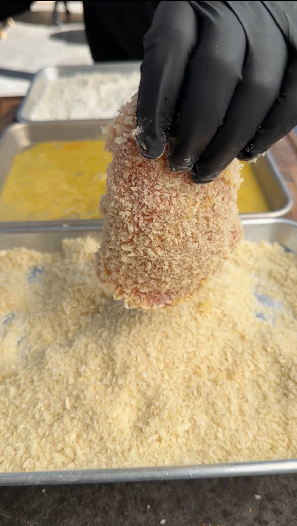 The dredging station has three bowls. Bowl one: seasoned flour. Bowl two: beaten eggs. Bowl three: panko breadcrumbs. The flour creates a dry base that helps the egg stick. The egg creates a wet adhesive layer that holds the panko. The panko creates the crispy exterior that defines the sandwich. Each layer serves a specific purpose, and skipping any of them results in breading that falls off during frying.