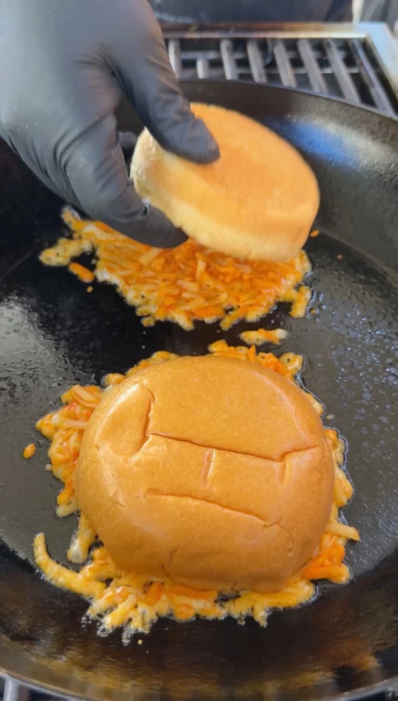 Heat a clean skillet over medium heat. Add a layer of shredded or sliced pepper jack cheese directly to the pan. Before the cheese fully melts, press the inside face of a brioche bun directly onto the melting cheese. Hold in place for 30 to 45 seconds. The cheese fuses to the bun and crisps into a lacy, golden crust. Lift the bun and the cheese should be attached in a thin, crunchy layer. Repeat for all buns.