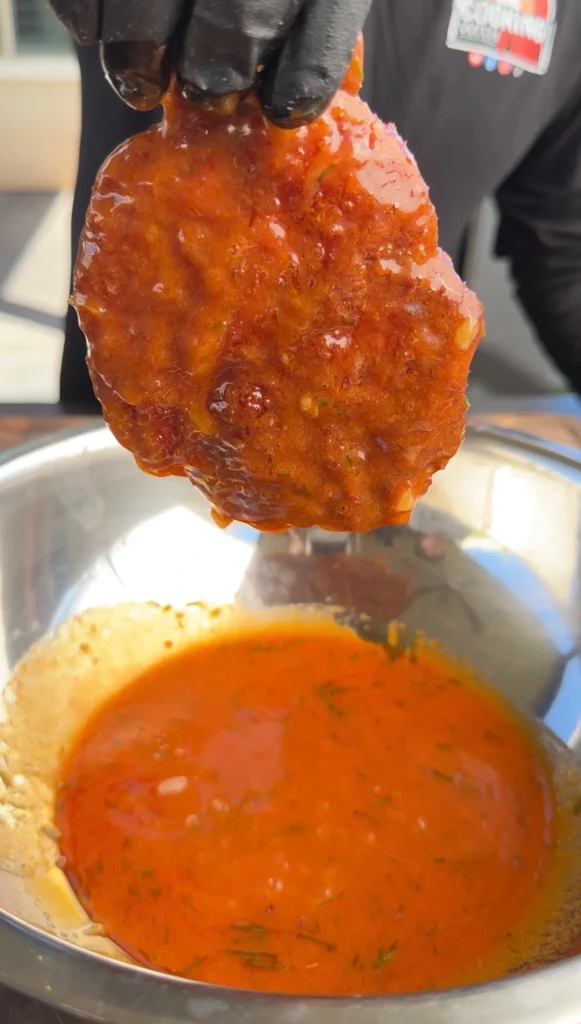 Combine hot sauce + butter + honey + garlic + chives. Heat until melted and glossy. Dunk each fried chop fully.
