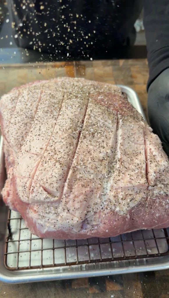 Let the seasoned pork sit while you preheat the smoker. The salt will start drawing moisture to the surface. This creates a tacky layer that helps bark formation.