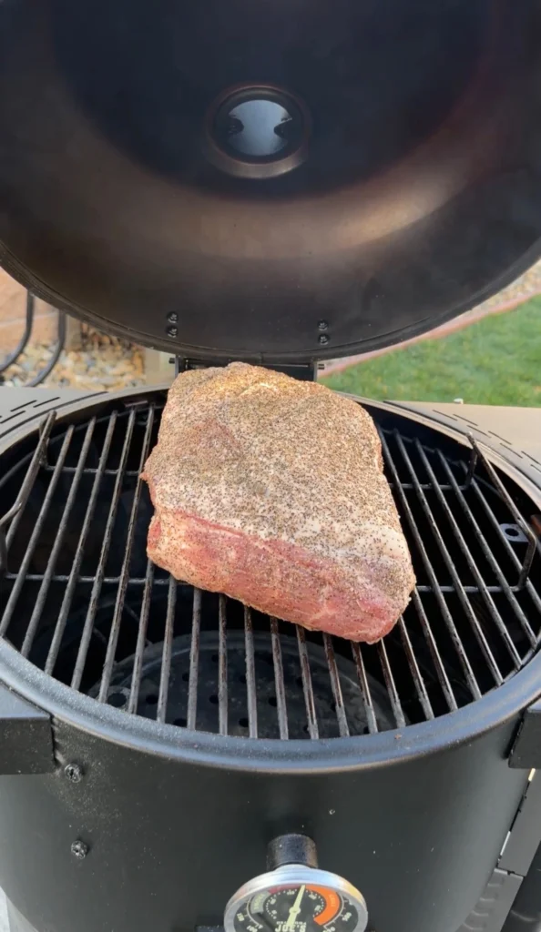Place the seasoned pork butt directly on the smoker grates, fat cap up. Close the lid immediately to maintain temperature.