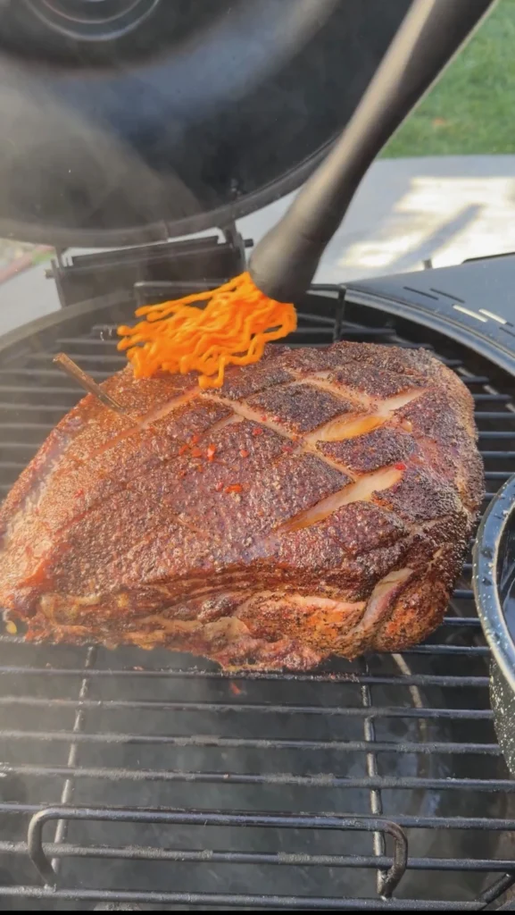 Pour ½ to ¾ cup of the vinegar mop sauce into the bottom of the pan around the pork. Don’t pour it directly over the bark. Let it pool in the pan.