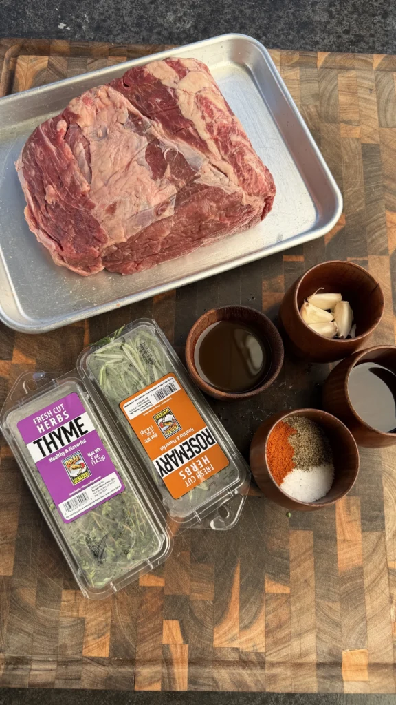 In a small bowl, combine 4 to 5 cloves of garlic (minced into a paste), 1 tablespoon finely chopped fresh rosemary, 1 tablespoon chopped fresh thyme, 2 tablespoons olive oil, 2 tablespoons kosher salt, 2 tablespoons coarse black pepper, 1 teaspoon smoked paprika, 1 teaspoon granulated garlic, and 1 teaspoon Dijon mustard (optional). Mix everything into a thick, spreadable paste. The olive oil binds the herbs and spices together so they adhere to the roast during the long smoke.