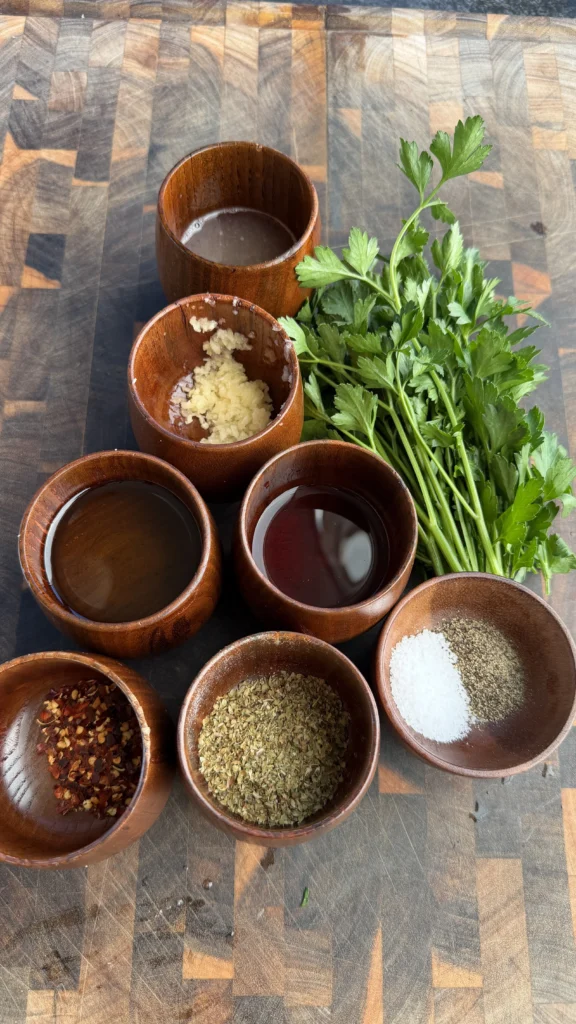 - Combine parsley, garlic, red wine vinegar, olive oil, red pepper flakes, salt, pepper, and lemon juice. Let sit 15-30 minutes.