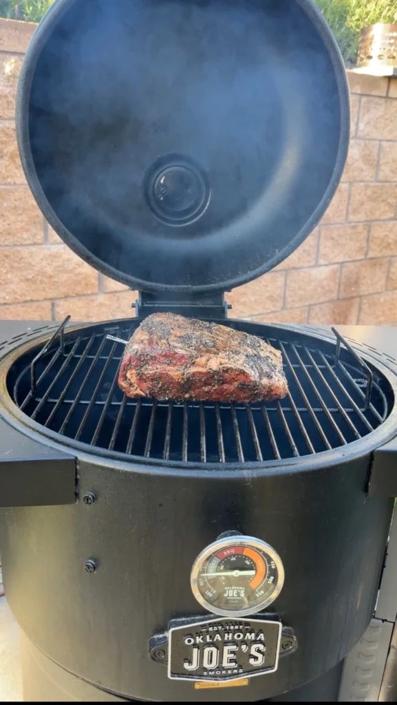 Both work well. Oak delivers a medium-intensity, clean smoke that doesn’t overpower the beef. Pecan is slightly sweeter and nuttier. Either complements the garlic herb crust without competing with it. Avoid mesquite, which can turn bitter on long cooks.