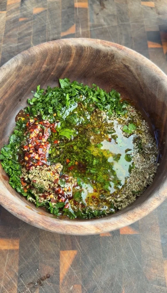 Chimichurri should have visible texture. Finely chop the parsley by hand rather than pulsing in a food processor. A food processor turns the herbs into a green paste and releases too much chlorophyll, making the chimichurri taste bitter and look muddy. Hand-chopped chimichurri has distinct herb pieces suspended in the olive oil and vinegar, which creates a better visual and more varied flavor in each bite.