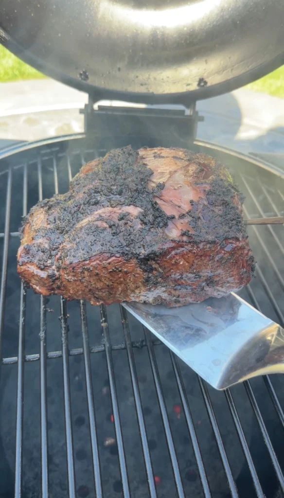During the smoke, the garlic herb paste toasts and forms a flavorful crust on the exterior. The rosemary and thyme release their aromatic oils into the crust. The smoked paprika deepens the color. The result is a crust that’s herby and garlicky with a slight char, not the heavy bark you see on brisket.